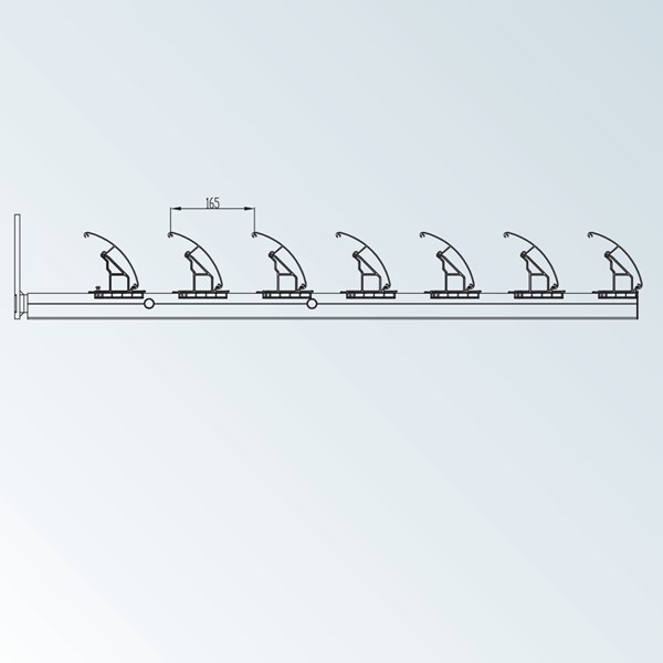 Permanent externes Sonnenschutzsystem. Die 150 D Aluminiumlamellen werden in einem festen Neigungswinkel von 45° an den Halteprofilen befestigt. Für den Abschluss stehen verschiedene Zierprofile zur Auswahl. Je nach Auskragung werden die Systeme nicht nur mit Wandplatten, sondern auch mit Zugankern an der Fassade befestigt.